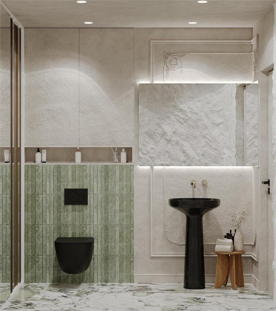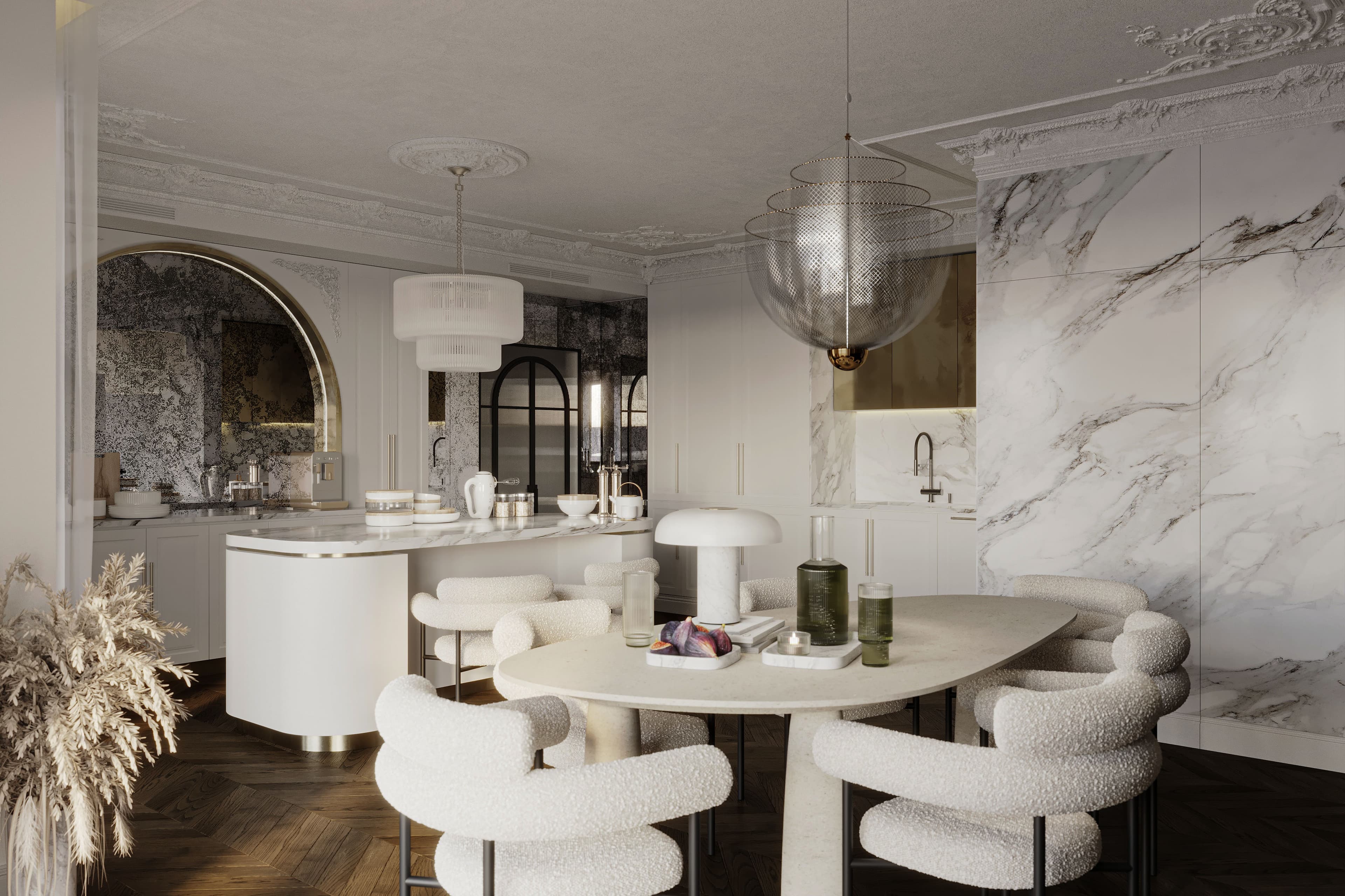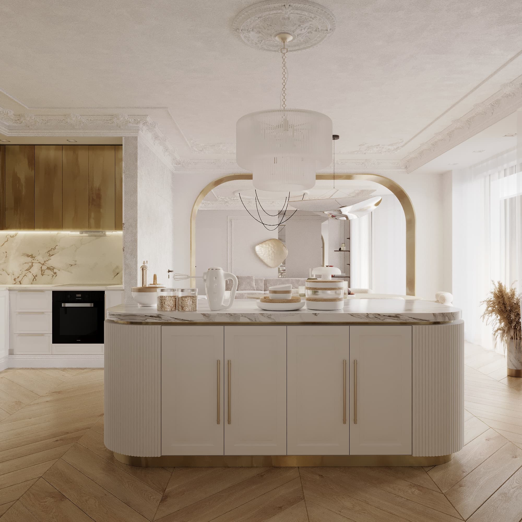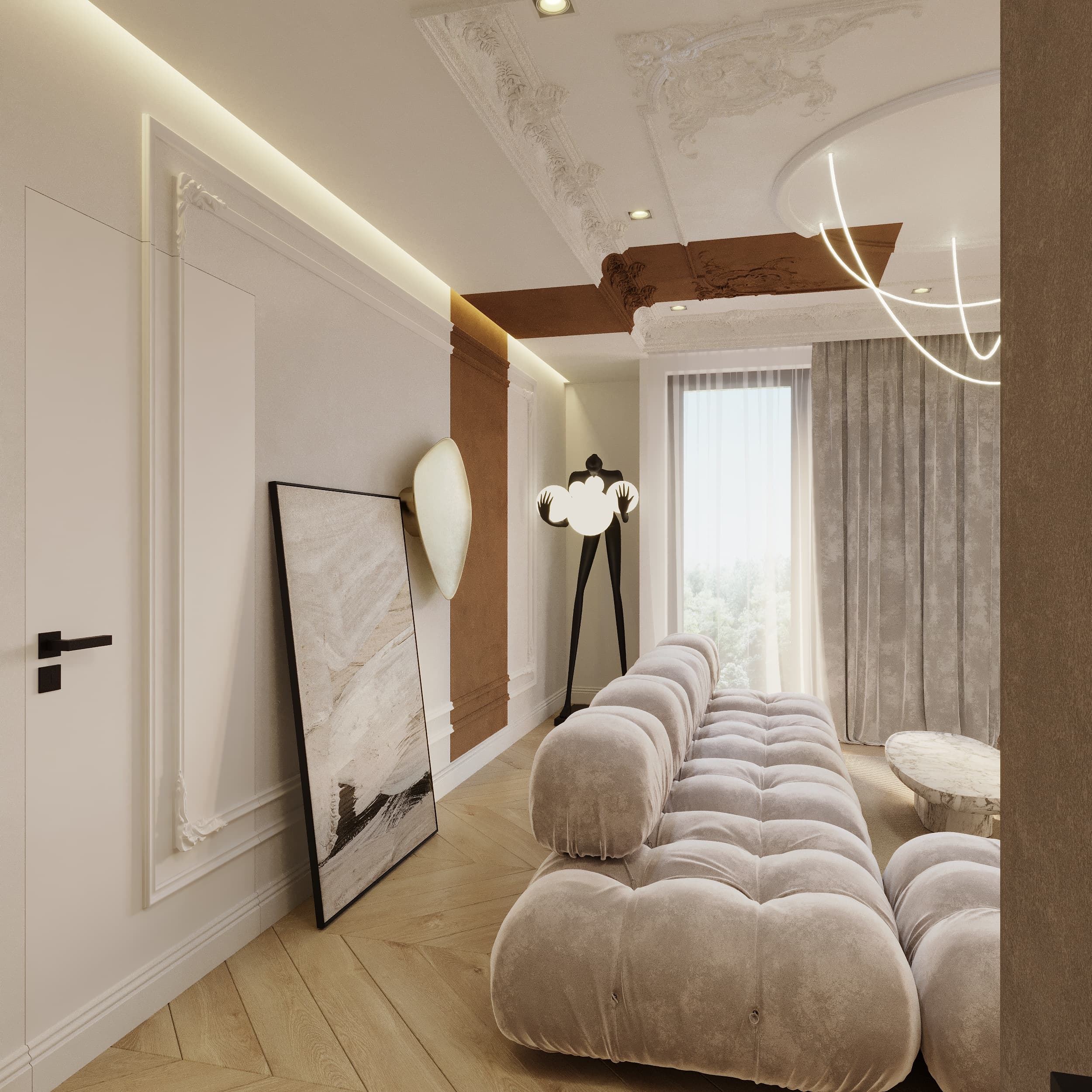 Beneficiarul și-au dorit un apartament spațios, iar prin alăturarea a două apartamente, am creat o zonă generoasă de open space pentru living și bucătărie. Cornisele înalte, plintele și braurile propuse subliniază dominanța stilului neoclasic.